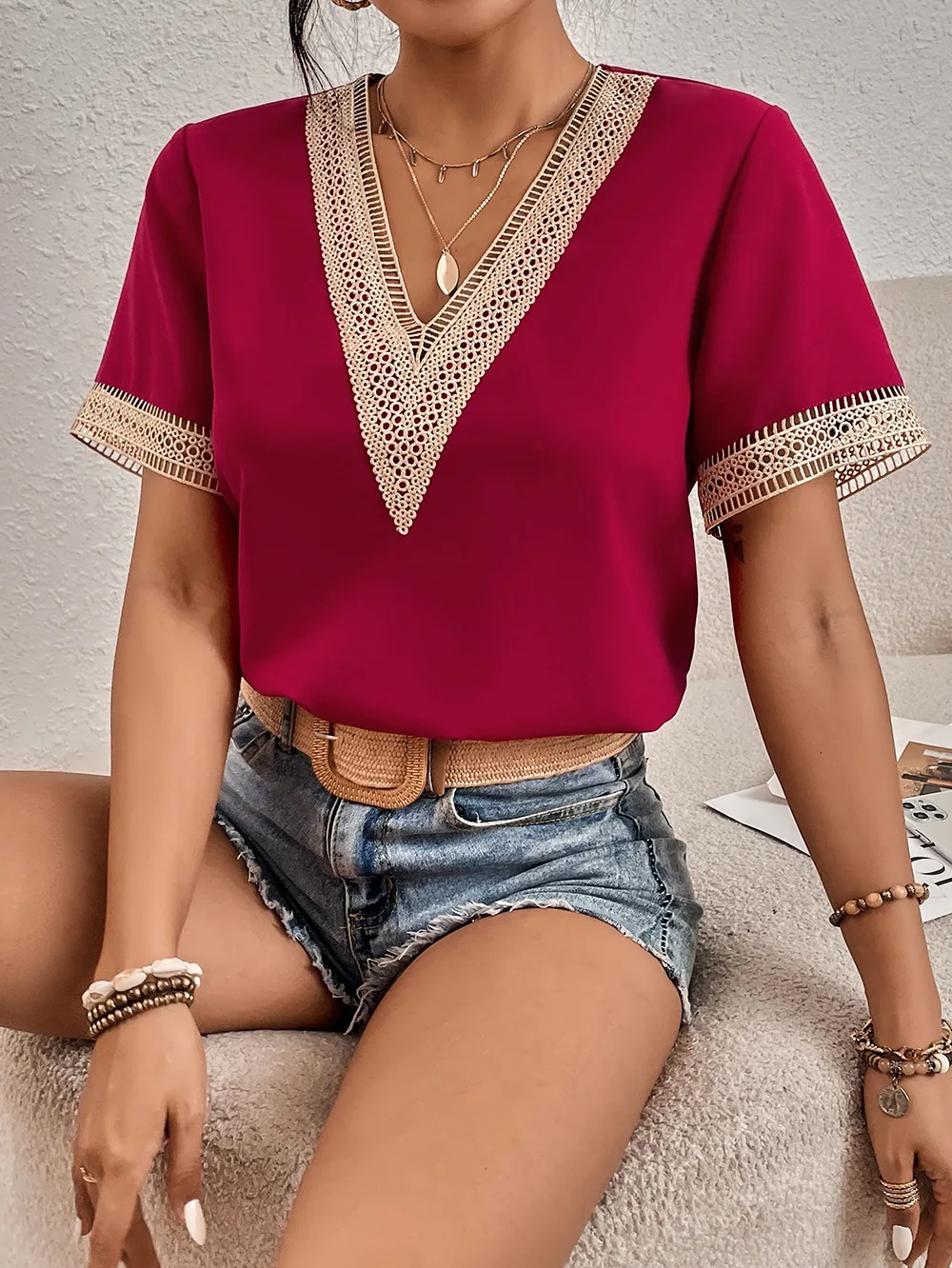 El cuello en V de esta camisa añade un toque de sensualidad y elegancia, mientras que las mangas cortas ofrecen una cobertura adecuada para mantenerte fresca y cómoda en todo momento. El detalle de encaje en el cuello agrega un toque de sofisticación y estilo, haciéndola perfecta para lucir tanto en el trabajo como en salidas informales con amigos o familiares. ¡Eleva tu estilo con esta blusa versátil y chic! ???